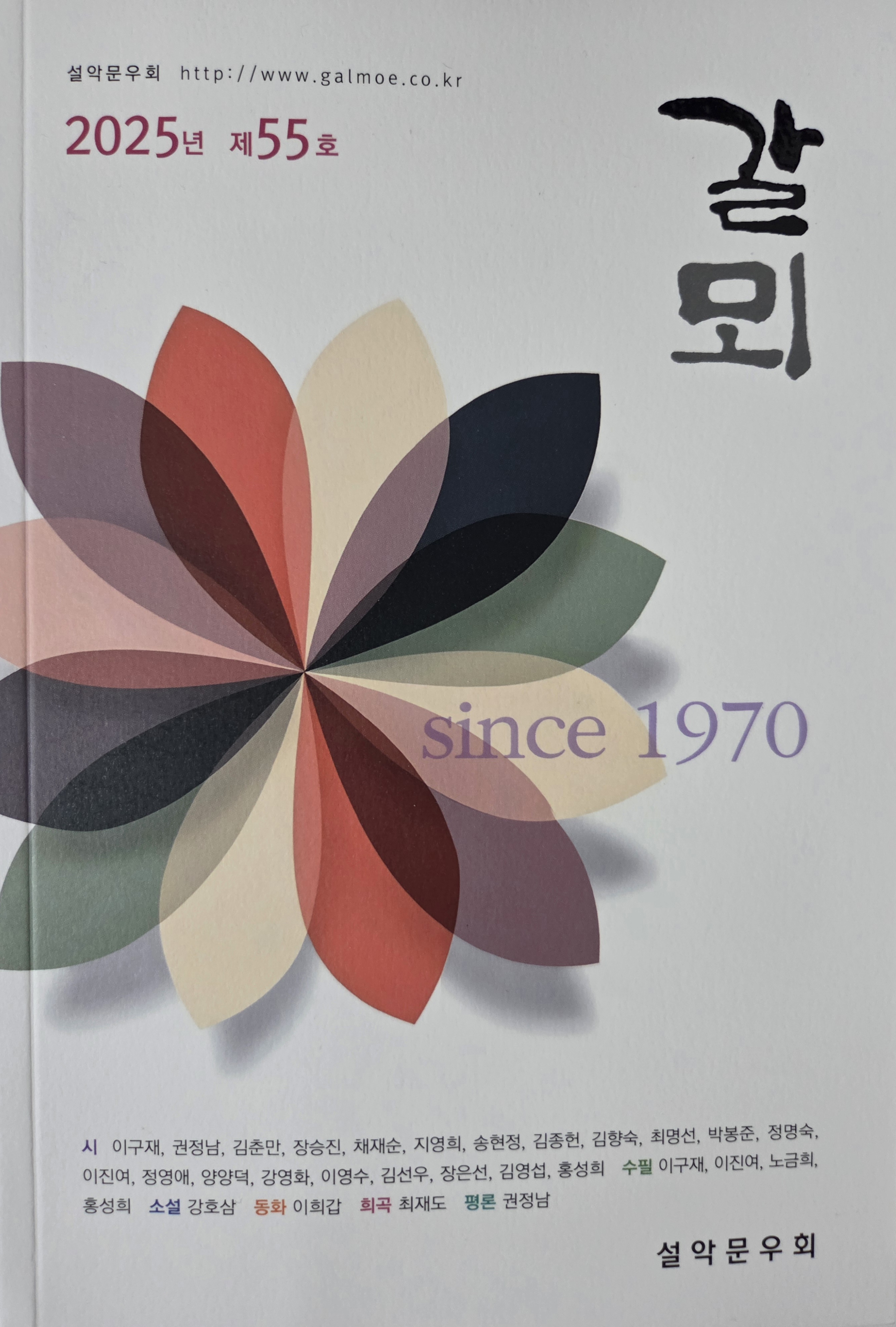 설악문우회 "갈뫼" 제55집이 나왔다.채재순 회장의 발간사와 함께 이구재 권정남 김춘만 장승진 지영희 송현정 김종헌 김향숙 최명선 박봉준 정명숙 이진여 정영애 양양덕 강영화 이영수 김선우 장은선 김영섭 홍성희의 신작시 120여 편의 작품과 노금희 등 네 명의 수필, 강호삼의 소설, 이희갑의 동화, 최재도의 희곡, ,권정남의 평론 등 다양한 작품들을 선보이고 있다. ㅡㅡㅡ ㅡㅡㅡㅡㅡㅡㅡㅡㅡㅡㅡㅡㅡㅡ 반계리 은행나무 장승진이 나무처럼 서 있고 싶어그 듬직한 곁을 수십 번 맴돌았다팔백 년은 바라지 않고그저 팔십 년의 반의반만이라도...한 자리에 뿌리내려잎 틔우고, 노랗게 물들고,잎 떨구고 다시 잎 틔우며온 마을이 다 은행나무 도고온 마을이 다 노랗게 타오르고재잘대던 아이들 돌아와수염이 날 때까지도눈 내리깔고,..
